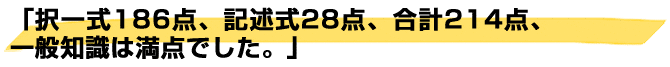 択一式186点、記述式28点、合計214点、一般知識は満点でした。