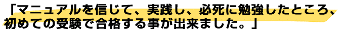 マニュアルを信じて、実践し、必死に勉強したところ、初めての受験で合格する事が出来ました。
