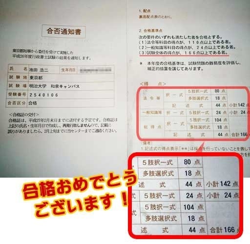 法令択一96点、記述26点、一般知識44点、合計166点