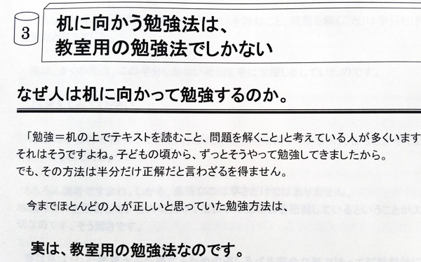 勉強法のマニュアルから一部抜粋しました。「第3章:机に向かう勉強法は、教室用の勉強法でしかない」