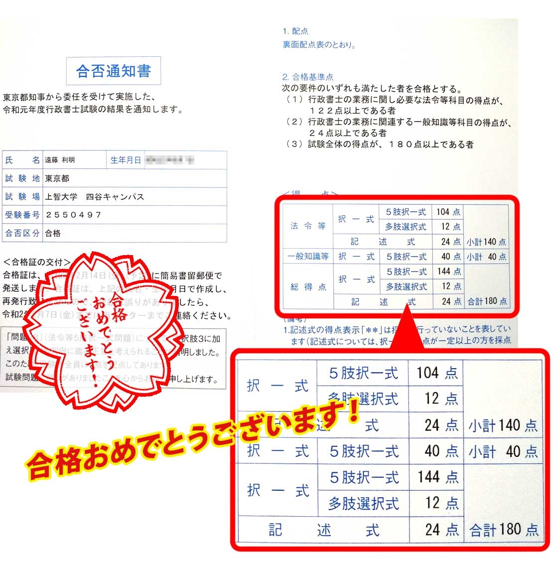 『自己採点では、178点で不合格と思っていましたが、180点で合格していたので、宙に舞い上がる感じでした。』