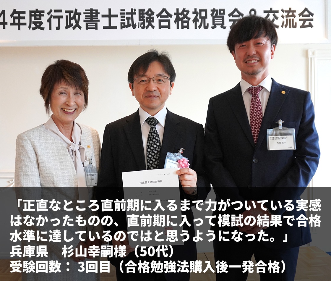 勤務先の総務部で業務を進める中で、民法、会社法の理解の必要性を感じたこと、また、人生100年と言われており、定年退職後も世の中の役に立つやり甲斐のある仕事として独立開業系士業としての 行政書士の可能性に強い関心を持つようになり、行政書士を目指そうと思いました。