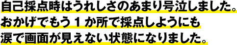 自己採点時はうれしさのあまり号泣しました。おかげでもう1か所で採点しようにも涙で画面が見えない状態になりました。