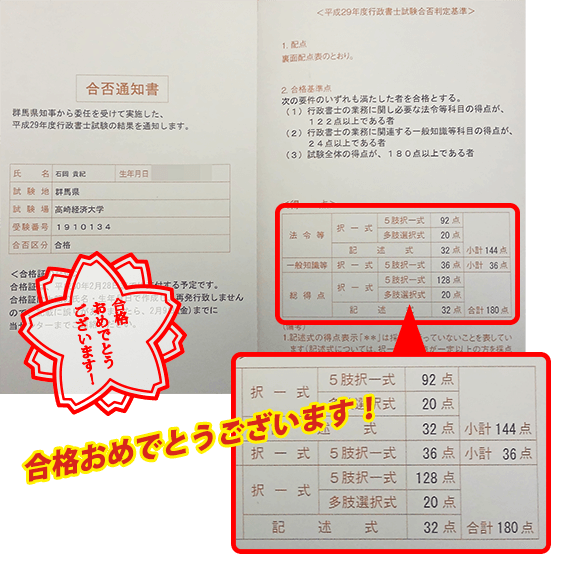 本試験では民法の8割近くが得点でき、行政法はやや点数を落としてしまったが、無事に合格できました。